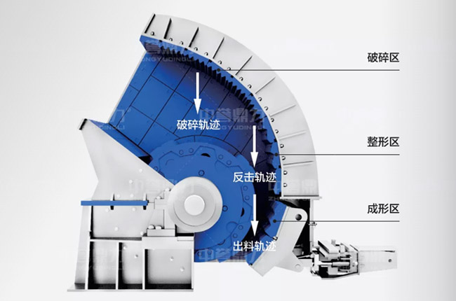 錘破制砂機(jī)內(nèi)部從上到下分別是物料的破碎區(qū)、整型區(qū)、成型區(qū),其中破碎區(qū)的襯板花紋設(shè)計(jì)為波浪下行式,對(duì)物料起到整形作用,中間的整型區(qū)反擊板采用了菱形花紋設(shè)計(jì),物料的運(yùn)動(dòng)軌跡在錘頭下方,有利于減少物料在機(jī)腔內(nèi)重復(fù)破碎;