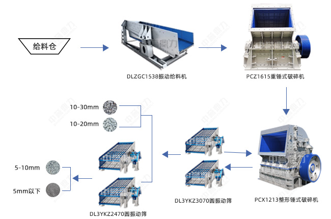 以上是時產(chǎn)600噸左右的石灰石錘式破碎工藝流程圖,圖中清晰看到,采用的是兩段破碎工藝,物料由振動給料機(jī)送入PCZ1615重型錘式破碎機(jī)做粗碎,粗碎后的物料部進(jìn)入PC1213整形錘式破碎機(jī)進(jìn)行細(xì)碎和整形,經(jīng)過兩道篩分,篩分出4種不同規(guī)格的成品料。