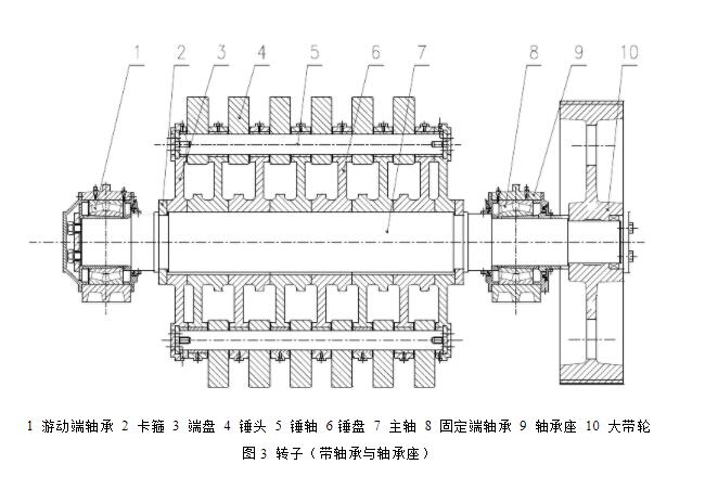從上面轉(zhuǎn)子結(jié)構(gòu)示意圖我們看到,2018單段錘式破碎機(jī)共有24個(gè)錘頭,每排6個(gè),共4排。
