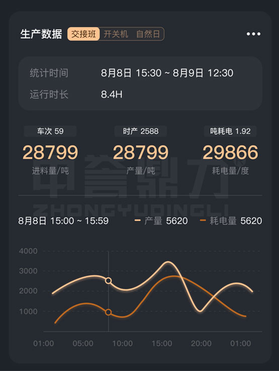 礦山管家APP可查看各類生產(chǎn)數(shù)據(jù),交接班(廠內(nèi)的上下班時(shí)間)、開關(guān)機(jī)(班次的開始結(jié)束時(shí)間)、自然日(0~24點(diǎn)) 進(jìn)料量(數(shù)據(jù)來自進(jìn)料系統(tǒng))、產(chǎn)量(數(shù)據(jù)來自皮帶秤)、耗電量(數(shù)據(jù)來自智能電表、能耗系數(shù)轉(zhuǎn)換) 產(chǎn)量耗電量趨勢對比曲線等。