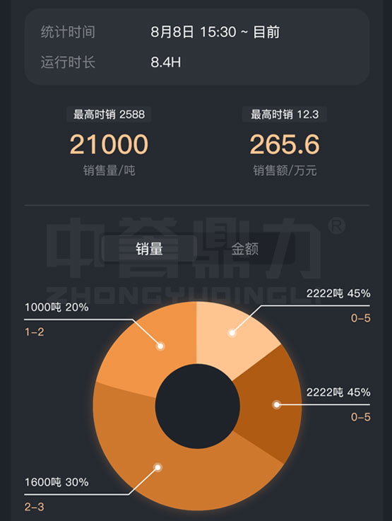 交接班(廠內(nèi)的上下班時(shí)間)、開關(guān)機(jī)(班次的開始結(jié)束時(shí)間)、自然日(0~24點(diǎn)) 銷量、銷售額(數(shù)據(jù)來自銷售系統(tǒng)) 各料類銷售占比餅圖,噸數(shù)、銷售額占比等各類銷售數(shù)據(jù)盤融入礦山管家APP,助力實(shí)現(xiàn)智慧礦山。