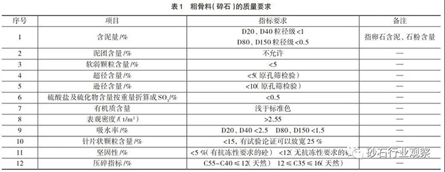 砂石骨料一般分為粗骨料和細骨料兩種,粒徑大于5mm的為粗骨料,小于5mm的為細骨料。粗骨料按粒徑80~150mm為特大石,40~80mm為大石,20~40mm為中石,5~20mm為細石;細骨料分為粗砂、中砂和細砂。骨料質(zhì)量管理主要控制粗骨料的遜徑和細骨料的石粉含量及細度模數(shù),混凝土用砂石骨料加工,質(zhì)量要求詳見下表。
