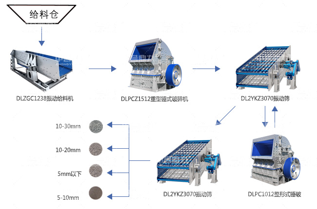 時(shí)產(chǎn)400噸破碎石料生產(chǎn)線設(shè)備有DLZGC1238振動(dòng)給料機(jī)、DLPCZ1512重型錘式破碎機(jī)、HD110顎式破碎機(jī)、PF1520反擊式破碎機(jī)、DLPC1022整形錘式破碎機(jī)、YKZ3070圓振篩等