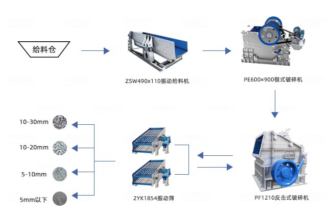 一般對于粒型較大的花崗巖、玄武巖、河卵石等中高硬度的物料,會采用二級破碎結(jié)構(gòu),采用鄂破進行粗碎,硬巖破碎設(shè)備進行中細碎加工。如原料粒度小于等于180mm,可直接使用硬巖破碎設(shè)備進行破碎作業(yè)。