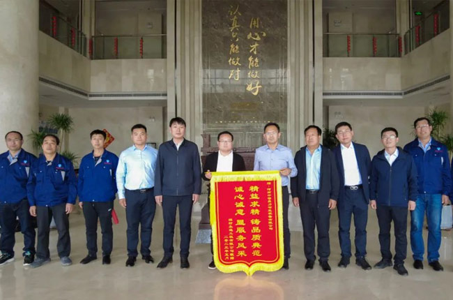 考察團來到中譽鼎力廠區(qū)后,首先送上了感謝錦旗,盛贊中譽鼎力“精益求精,鑄品質(zhì);誠心誠意,顯服務風采”。