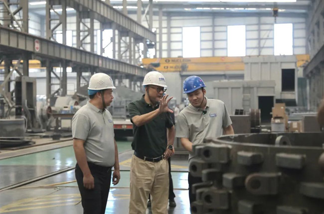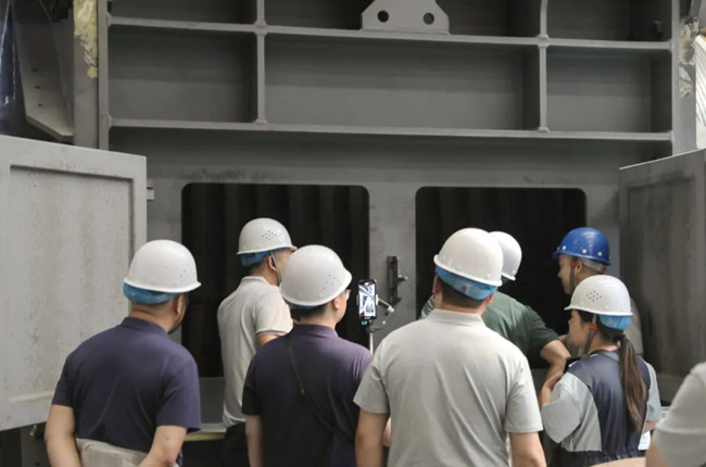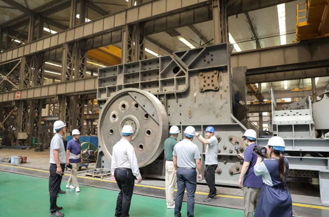 中譽鼎力集團副董事長馬鈺博、技術(shù)總監(jiān)劉海淘在智能化車間為砂石骨料網(wǎng)考察團成員一一介紹了集團主營產(chǎn)品及其制造工藝,并對硬巖設備代表產(chǎn)品臥式旋回破碎機進行了詳細的講解。