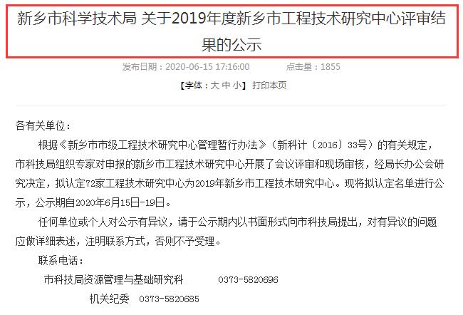 近日,新鄉(xiāng)市科學(xué)技術(shù)局發(fā)布《關(guān)于2019年度新鄉(xiāng)市工程技術(shù)研究評(píng)審結(jié)果的公示》。根據(jù)《新鄉(xiāng)市市級(jí)工程技術(shù)研究管理暫行辦法》(新科計(jì)〔2016〕33號(hào))有關(guān)規(guī)定,科學(xué)技術(shù)局組織開(kāi)展了“2019年度新鄉(xiāng)市工程技術(shù)研究”申報(bào)工作。