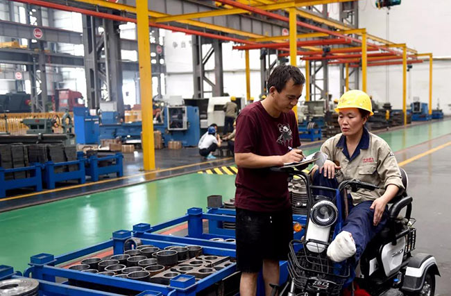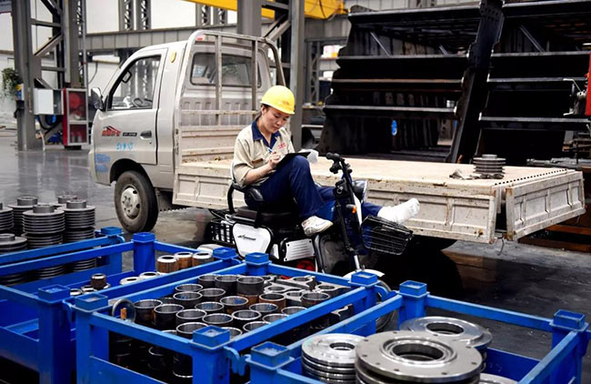 7月22日上午10點(diǎn),中譽(yù)鼎力智能裝備生產(chǎn)車間機(jī)加工區(qū)新到了一批外協(xié)件,張衛(wèi)霞坐在電動三輪車上依次仔細(xì)地檢查著每一個零部件:觀察、測量、記錄、填單……嚴(yán)謹(jǐn)?shù)馁|(zhì)檢流程沒有因?yàn)槟_受傷而有所耽誤。