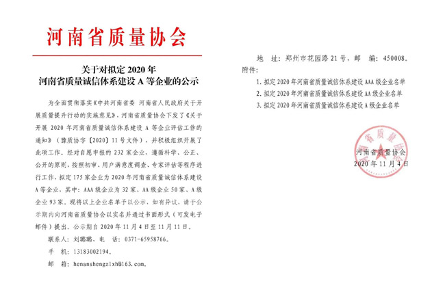 為面貫徹落實(shí)《中共河南省委河南省人民關(guān)于開展質(zhì)量提升行動(dòng)的實(shí)施意見》,河南省質(zhì)量協(xié)會(huì)下發(fā)了《關(guān)于開展2020年河南省質(zhì)量誠信體系建設(shè)A等企業(yè)評(píng)估工作的通知》(豫質(zhì)協(xié)字[2020]11號(hào)文件),中譽(yù)鼎力軟件科技股份有限公司積參評(píng)。公司自成立以來,堅(jiān)持“一言九鼎誠信天下”的經(jīng)營理念,秉持對(duì)客戶負(fù)責(zé)的態(tài)度,以工匠精雕鑄鼎力品質(zhì),不斷開拓公司業(yè)務(wù),樹立了守法履約的良好企業(yè)形象和客戶口碑,入選“2020年河南省質(zhì)量誠信體系建設(shè)AA級(jí)企業(yè)”名單。
