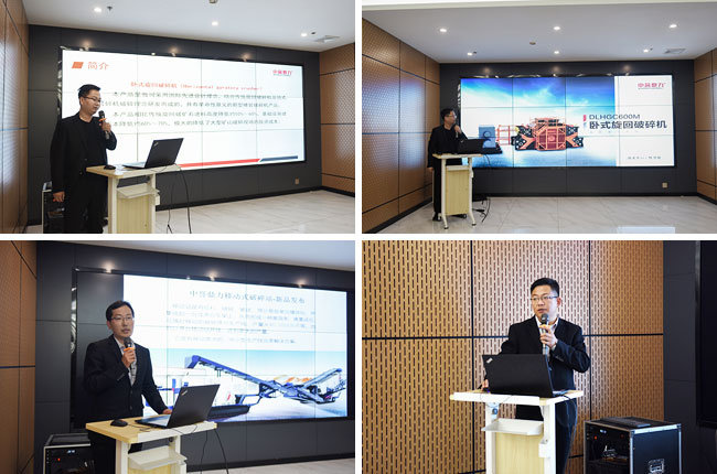 礦山設(shè)備新品發(fā)布環(huán)節(jié),中譽鼎力智能裝備有限公司技術(shù)中心陳碧、楊鵬飛、王興乾三位技術(shù)工程師,以結(jié)構(gòu)組成分析、性能特點介紹、同類設(shè)備對比、動畫視頻演示等多種形式,先后對公司新品DLHGC600臥式旋回破碎機(粗碎)、DLHGC600M臥式旋回破碎機(中細(xì)碎)、移動式破碎站、干式制砂樓四款設(shè)備進(jìn)行了詳盡的講解。