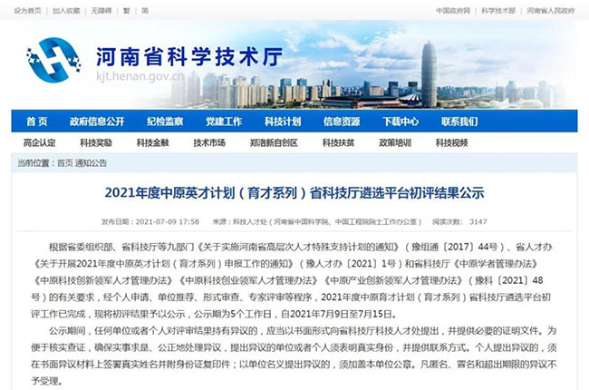 根據(jù)河南省委組織部、省科技廳等九部門《關于實施河南省高層次人才支持計劃的通知》(豫組通〔2017〕44號)、省人才辦《關于開展2021年度中原英才計劃(育才系列)申報工作的通知》(豫人才辦〔2021〕1號)和省科技廳《中原學者管理辦法》《中原科技創(chuàng)新軍人才管理辦法》《中原科技創(chuàng)業(yè)軍人才管理辦法》《中原產(chǎn)業(yè)創(chuàng)新軍人才管理辦法》(豫科〔2021〕48號)的有關要求,經(jīng)個人申請、單位、形式審查、評審等程序,7月9日,2021年度中原育才計劃(育才系列)省科技廳遴選平臺初評工作完成,并將結果予以公示。
