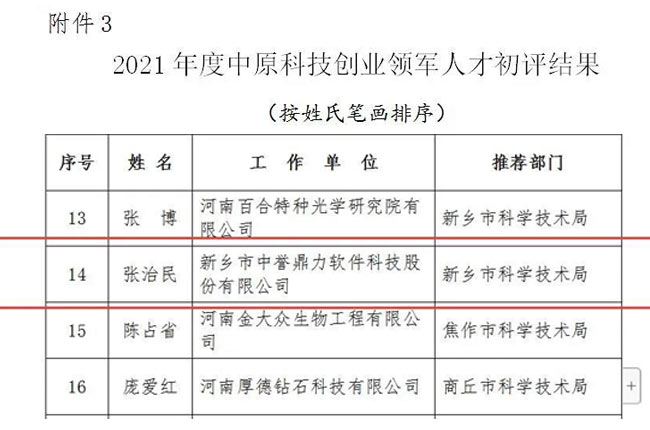 經(jīng)新鄉(xiāng)市科學技術局,新鄉(xiāng)市中譽鼎力軟件科技股份有限公司董事長張治民成功入選2021年度“中原科技創(chuàng)業(yè)軍人才”名單,并順利通過公示!