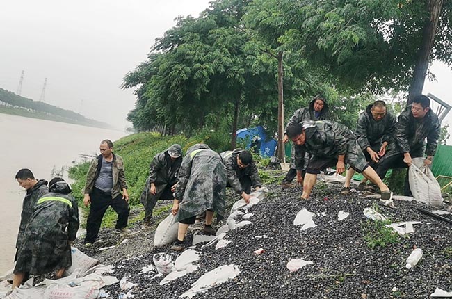 范工和大家一起“扎根”孟姜女河堤,嚴(yán)陣以待投入河道防汛救災(zāi)工作(下圖右一)。他們頂風(fēng)冒雨,不顧個(gè)人安危,搶裝防汛沙袋堵住壩口,一天一夜未眠,盡力守護(hù)河堤安。