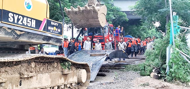 現(xiàn)場的施工人員說:在聶書記的帶下,我們奮戰(zhàn)了一天一夜,終于將東孟河堤打通,成功泄洪,排水量一天達到150萬方,還會一鼓作氣再打通幾個,爭取在短時間內將城市積水排完!