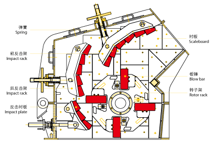 錘破:經(jīng)給料機(jī)進(jìn)入破碎機(jī)進(jìn)料口的礦料,在高速旋轉(zhuǎn)的錘頭的作用下被次破碎,之后反彈,又以高速撞擊在反擊板上進(jìn)一步被破碎,在整個過程中,礦石受到多次破碎,破碎合格的礦料經(jīng)過篩條裝置排出,不合格的礦料繼續(xù)留在破碎腔破碎,大塊石料在破碎腔內(nèi)受到多次破碎,合格的礦料被及時排出,不會出現(xiàn)過粉碎現(xiàn)象。