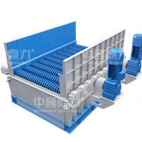滾軸篩由箱體、軸承座、鏈條、鏈輪、滾軸、滾片、電機(jī)等結(jié)構(gòu)組成。開(kāi)機(jī)啟動(dòng)后,鏈輪通過(guò)鏈條帶動(dòng)滾軸翻轉(zhuǎn),滾軸轉(zhuǎn)動(dòng)方向與物料流動(dòng)方向一致,泥土從相鄰滾軸與圓盤之間的間隙漏出,落在機(jī)器底部的皮帶機(jī)上排出,滾軸上方的大塊物料運(yùn)動(dòng)到設(shè)備末端后排出,完成泥石分離。各軸之間的間隙可以根據(jù)實(shí)際需求進(jìn)行定制。