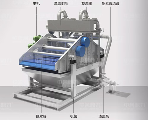 中譽鼎力細砂回收脫水一體機由旋流器、溢流水箱、鋼絲纏繞管、電機、脫水篩、機架、渣漿泵等組成,在工作時,渣漿泵將篩水混合物輸送到旋流器中,細砂經(jīng)沉沙嘴進入到下方的脫水篩中,經(jīng)脫水篩脫水后,細砂與水實現(xiàn)分離,剩余的少量細砂和泥等雜質,經(jīng)過溢流水箱進入污水處理系統(tǒng),沉淀后進行水資源再次利用。