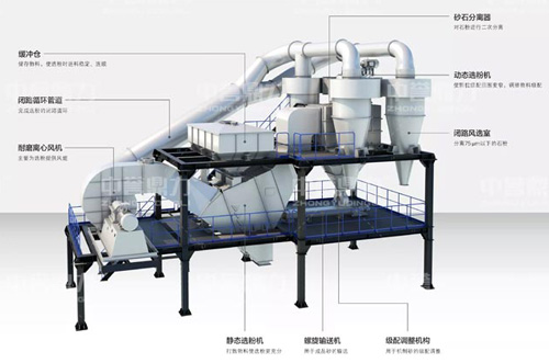 從選粉樓內(nèi)部結(jié)構(gòu)圖可以看到,設(shè)備主要由緩沖倉(cāng)、動(dòng)態(tài)選粉機(jī)、靜態(tài)選粉機(jī)、風(fēng)機(jī)、循環(huán)管道、風(fēng)選室、砂石分離器、螺旋輸送機(jī)、級(jí)配調(diào)節(jié)裝置等部分組成。