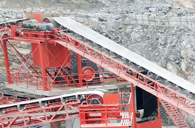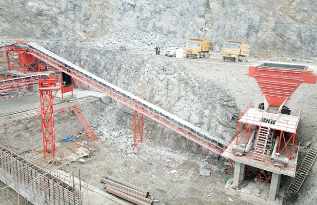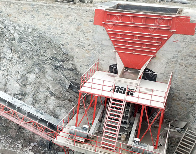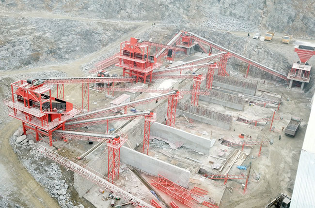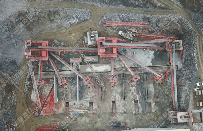 工藝流程:原料經(jīng)料倉由ZG1550振動(dòng)給料機(jī)送到重型錘式破碎機(jī)PCZ1615進(jìn)行初步破碎,破碎后的物料被輸送到整形破XPC1622進(jìn)行加工,加工后的物料輸送到一組3YKZ3070并篩進(jìn)行篩分,篩分三種成品料,其中一部分被送到雙轉(zhuǎn)子制砂機(jī)ZSJ1218進(jìn)行細(xì)碎,不滿足成品料粒度要求的被返回整形破進(jìn)行再次加工,其余物料被送到下一組3YKZ3070并篩進(jìn)行篩分,篩分出三種成品料,分別送到成品料倉中。