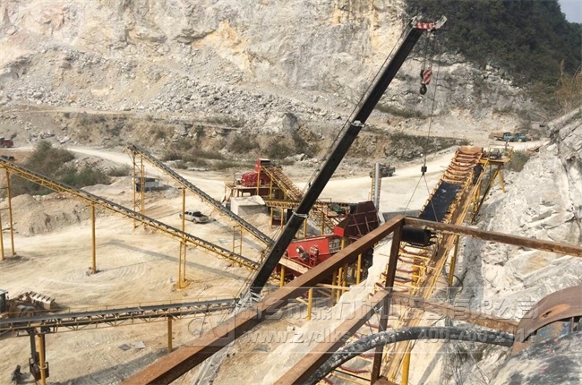 上圖為時產(chǎn)800噸碎石生產(chǎn)線的生產(chǎn)現(xiàn)場,依托山勢將山石進行破碎,不僅利用了當?shù)氐馁Y源,而且減少了物料輸送過程中的能源消耗,生產(chǎn)效率大大提高。