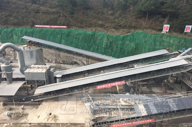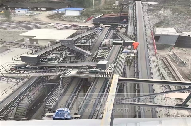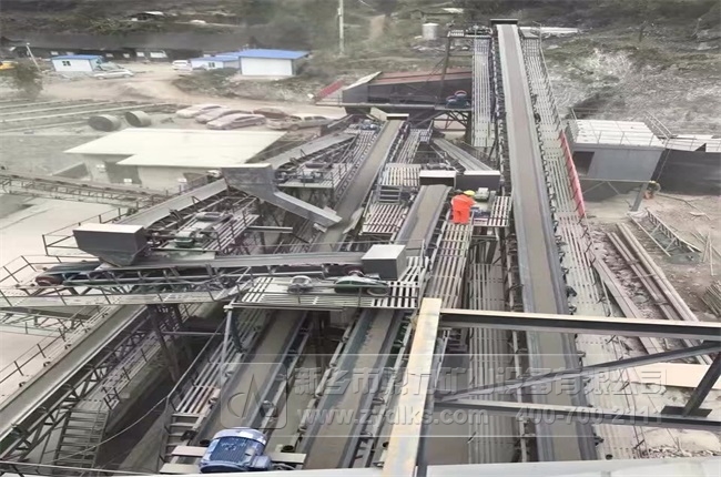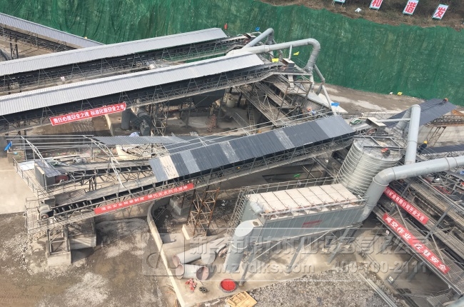 上圖為貴州遵義同興源建材時產(chǎn)1000噸骨料生產(chǎn)線生產(chǎn)現(xiàn)場,排列整齊的皮帶輸送帶有序的運送骨料,在一些皮帶輸送機密集的區(qū)域,設(shè)置了脈沖袋式除塵器,也是由中譽鼎力研發(fā)的,將設(shè)備安裝在基臺上方,占地面積小,節(jié)省基建投資。