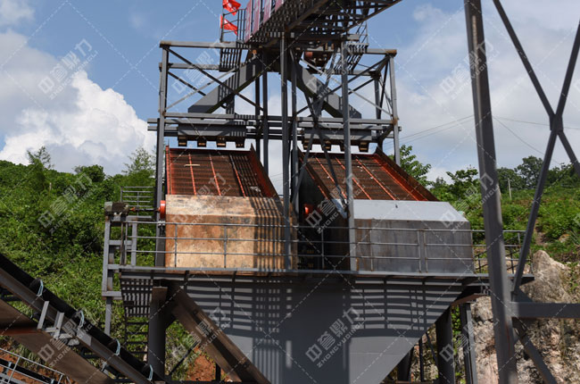石料經(jīng)過顎破粗碎后進(jìn)到中轉(zhuǎn)料倉,被輸送帶送到兩臺(tái)ZSJ1213雙轉(zhuǎn)子制砂整形機(jī)進(jìn)行破碎整形,經(jīng)過再次加工的物料被送到一組3YKZ2470并篩進(jìn)行篩分,終篩分出1-3石子和機(jī)制砂兩種成品料,篩分出來的0-5和回料被一條返料輸送帶送到中轉(zhuǎn)料倉,這樣形成一個(gè)閉路循環(huán)。
