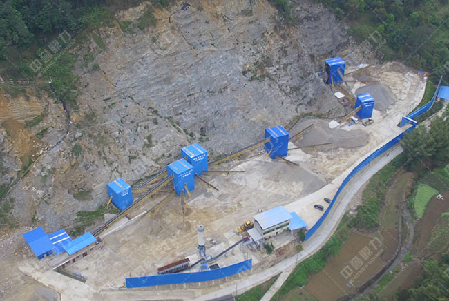 機械搭配:ZG振動給料機、PCZ1820重錘式破碎機、XPC1622整形錘破、4YKZ4070圓振動篩、輸送機、除塵設備