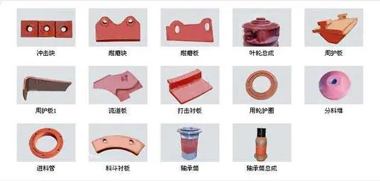 沖擊破制砂機易損件共有15個:上/下軸套(進料斗部位)、減震橡膠、甩輪護口圈、上∕下流道板、沖擊塊、分料錐、板、拋料頭、下料襯環(huán)、進料管、上∕下?lián)舸蜃o板、料斗襯環(huán)、分料盤、散料盤、周護板等。