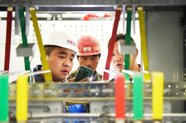 工作人員正在配電室檢查低壓配電系統(tǒng)。