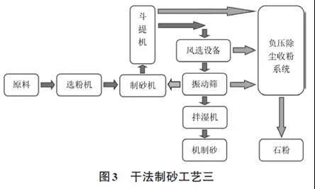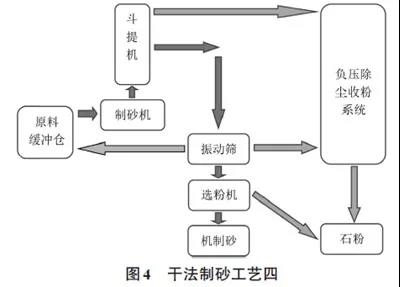 圖4表示砂石分選設(shè)備布置在制砂機出料位置,先粉碎以及篩選分級再選粉出砂,主流運用單位有中聯(lián)水泥等。