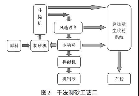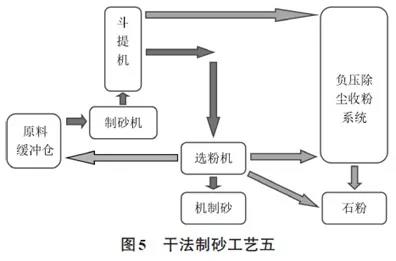 圖5表示砂石分選設(shè)備布置在制砂機出料位置,無震動篩分工序,利用砂石分選設(shè)備做出除粉以及出砂。