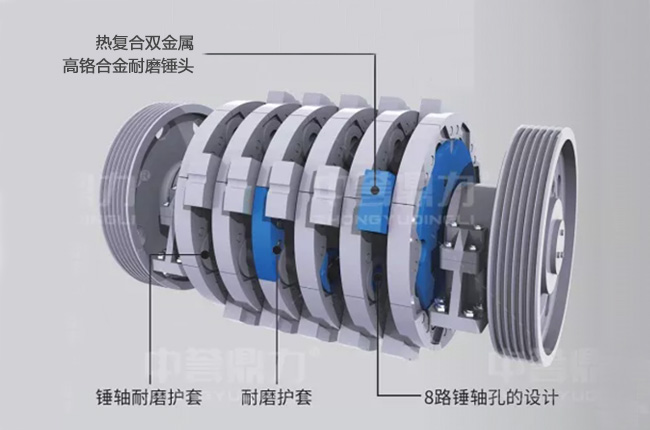 出料口采用無篦條設(shè)計(jì),滿足出料粒度要求的直接排出,減少了物料在機(jī)腔內(nèi)的停留時(shí)間,對(duì)錘頭等配件的磨損較。徊捎脽釓(fù)合雙金屬,高鉻合金耐磨錘頭,使用壽命比普通錘頭提高至少15%;轉(zhuǎn)子外圍加裝耐磨護(hù)圈,避免物料與轉(zhuǎn)子本身的直接碰撞,增加轉(zhuǎn)子使用時(shí)間;